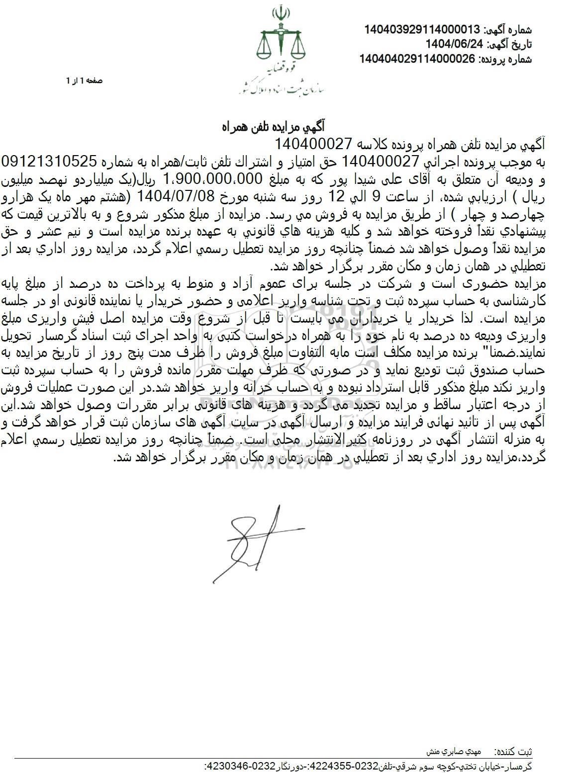 آگهی مزایده تلفن همراه به شماره 09121310525 به مبلغ 1.900.000.000 ریال