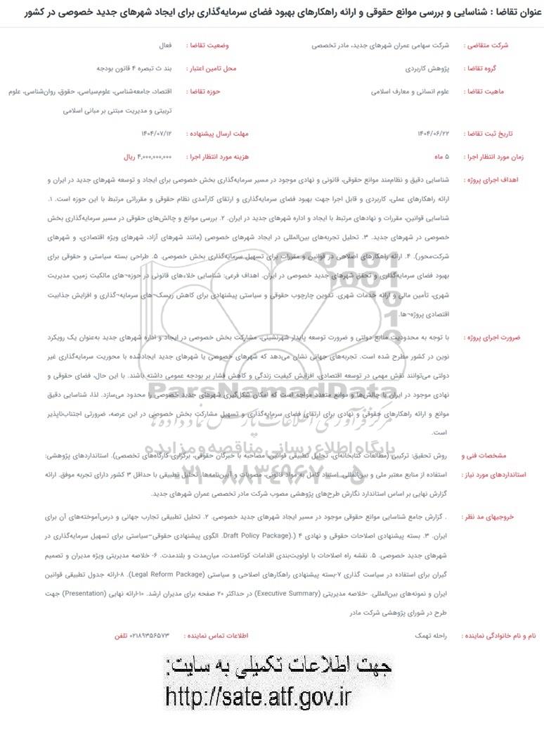 فراخوان شناسایی و بررسی موانع حقوقی و ارائه راهکارهای بهبود فضای سرمایه گذاری برای ایجاد شهرهای جدید خصوصی در کشور از کلیه افراد متخصص و شرکتها واجد شرایط دعوت به عمل میآید در مناقصه با کد خبرگزاری پارس نماد: 9551609 شرکت نمایند.