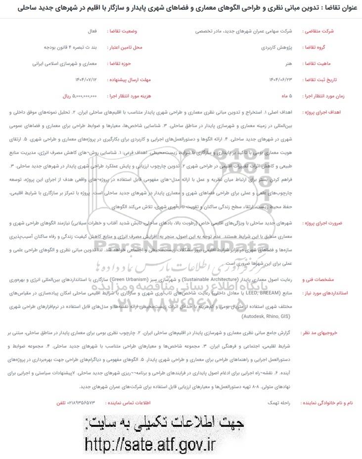 فراخوان تدوین مبانی نظری و طراحی الگوهای معماری و فضاهای شهری پایدار و سازگار با اقلیم در شهرهای جدید ساحلی از کلیه افراد متخصص و شرکتها واجد شرایط دعوت به عمل میآید در مناقصه با کد خبرگزاری پارس نماد: 9551617 شرکت نمایند.