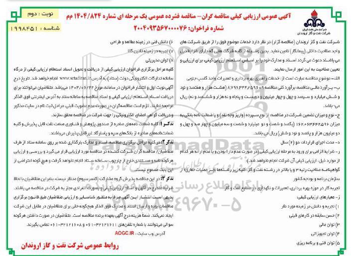 شرکت نفت و گاز اروندان (مناقصه گزار) در نظر دارد خدمات موضوع فوق را از طریق شرکتهای واجد صلاحیت داخلی (پیمانکار) تامین نماید. بدین وسیله از کلیه شرکت هایی که دارای شرایط ذیل می باشند دعوت می گردد اسناد و مدارک خود را بر اساس استعلام ارزیابی کیفی، برای ارزیابی و تعیین صلاحیت به این امور ارسال نمایند
