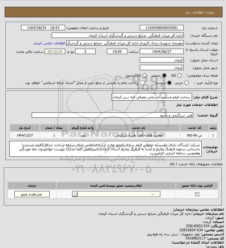 شرح کلی نیاز: ساخت فیلم مستند داستانی معرفی قبه سبز کرمان