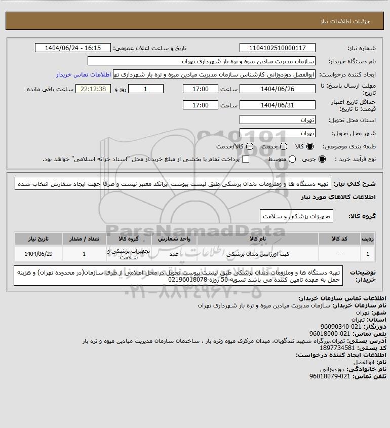 | 1 | -- | کیت اورژانس دندان پزشکی | عدد | تجهیزات پزشکی و سلامت | 1 | 1404/06/29 |
