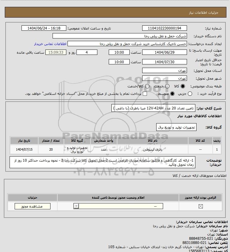 شرح کلی نیاز: تامین تعداد 20 عدد 12V-42AH صبا باطری (با داغی )