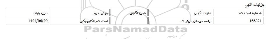 | 166321 | ترانسفورماتور تروئیدی | استعلام الکترونیکی | 1404/06/29 |