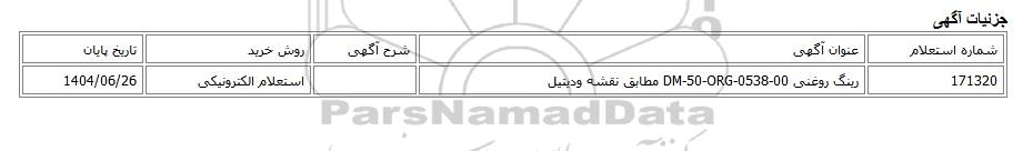 | 171320 | رینگ روغنی DM-50-ORG-0538-00 مطابق نقشه ودیتیل | استعلام الکترونیکی | 1404/06/26 |