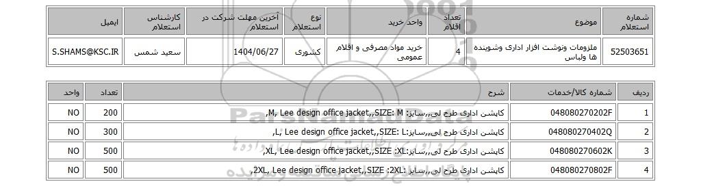 | 52503651 | ملزومات ونوشت افزار اداری وشوینده ها ولباس | 4 | خرید مواد مصرفی و اقلام عمومی | کشوری | 1404/06/27 | سعید شمس | S.SHAMS@KSC.IR |