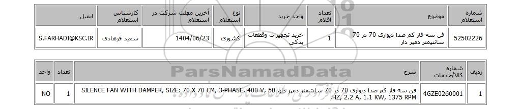 | 52502226 | فن سه فاز کم صدا دیواری 70 در 70 سانتیمتر دمپر دار | 1 | خرید تجهیزات وقطعات یدکی | کشوری | 1404/06/23 | سعید فرهادی | S.FARHADI@KSC.IR |