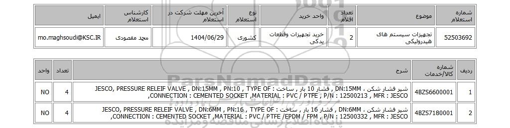 | 52503692 | تجهیزات سیستم های هیدرولیکی | 2 | خرید تجهیزات وقطعات یدکی | کشوری | 1404/06/29 | محمد مقصودی | mo.maghsoudi@KSC.IR |