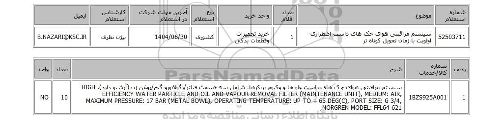 | 52503711 | سیستم مراقبتی هوای جک های داست-اضطراری-اولویت با زمان تحویل کوتاه تر | 1 | خرید تجهیزات وقطعات یدکی | کشوری | 1404/06/30 | بیژن نظری | B.NAZARI@KSC.IR |