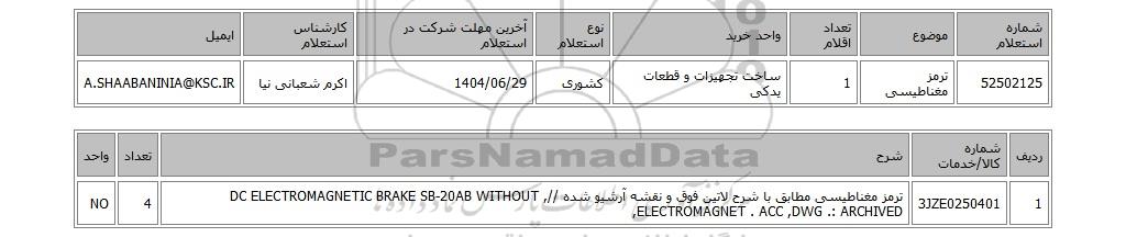 | 52502125 | ترمز مغناطیسی | 1 | ساخت تجهیزات و قطعات یدکی | کشوری | 1404/06/29 | اکرم شعبانی نیا | A.SHAABANINIA@KSC.IR |