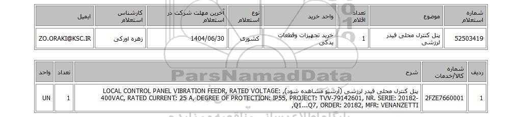 | 52503419 | پنل کنترل محلی فیدر لرزشی | 1 | خرید تجهیزات وقطعات یدکی | کشوری | 1404/06/30 | زهره اورکی | ZO.ORAKI@KSC.IR |