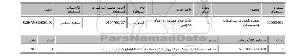 | 52503401 | تعمیرونگهداری ساختمان وتاسیسات | 1 | خرید مواد مصرفی و اقلام عمومی | کشوری | 1404/06/27 | سعید شمس | S.SHAMS@KSC.IR |