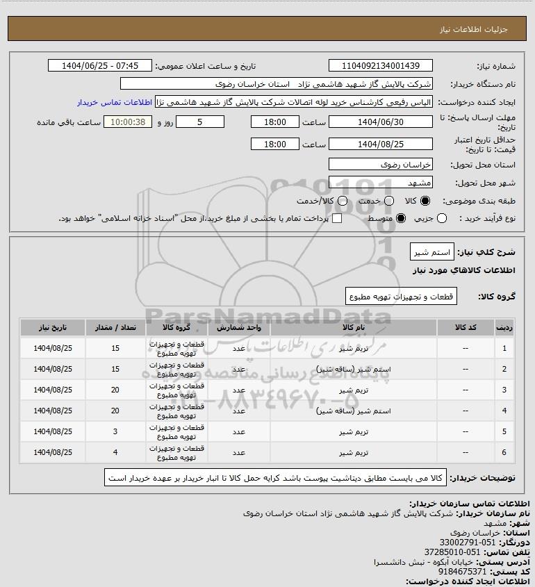 نام دستگاه خریدار:شرکت پالایش گاز شهید هاشمی نژاد استان خراسان رضوی