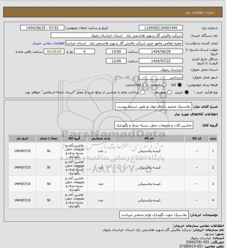 | 3 | -- | کیسه پلاستیکی | عدد | ماشین آلات و ملزومات حمل، بسته بندی و نگهداری | 50 | 1404/07/15 |