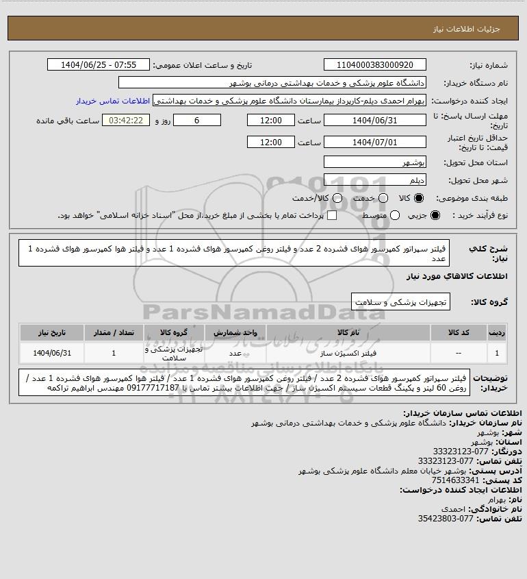 استعلام بها و موضوع استعلام استعلام فیلتر سپراتور کمپرسور هوای فشرده 2 عدد و فیلتر روغن کمپرسور هوای فشرده 1 عدد و فیلتر هوا کمپرسور هوای فشرده 1 عدد به اطلاع کلیه شرکت‌ها و افراد متخصص واجد شرایط می‌رساند، آگهی گذار در نظر دارد از طریق استعلام بها، نسبت به انتخاب و دریافت پیشنهادات اقدام نماید. این استعلام با کد آگهی ثبت شده در سامانه خبرگزاری پارس نماد : 9552999 منتشر شده است. مشخصات استعلام : تاریخ شروع استعلام: 1404/06/25 آخرین مهلت ارسال پیشنهاد قیمت : 1404/06/31 و محل اجرای پروژه : استان بوشهر میباشد. استعلام قیمت مورد درخواست : استعلام فیلتر سپراتور کمپرسور هوای فشرده 2 عدد و فیلتر روغن کمپرسور هوای فشرده 1 عدد و فیلتر هوا کمپرسور هوای فشرده 1 عدد با دسته‌بندی‌های تخصصی و گروه های مرتبط : انواع فیلتر های تصفیه, خدمات و تجهیزات آزمایشگاهی و پزشکی, کمپرسورهای هوا, استعلام اطلاع رسانی میگردد.