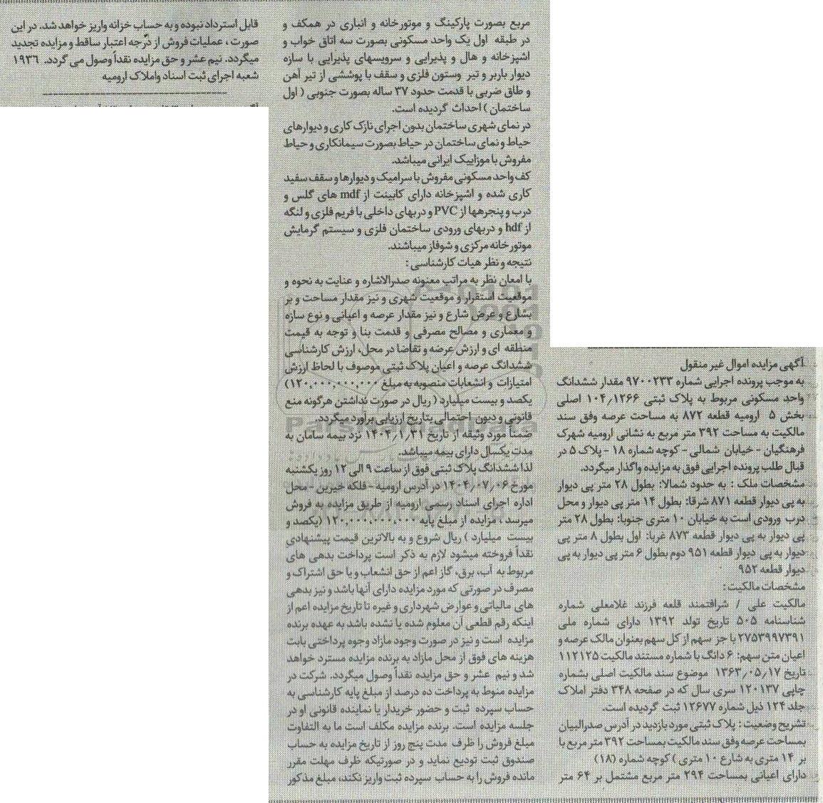 مزایده ششدانگ واحد مسکونی به پلاک ثبتی 104.1266 اصلی بخش 5
