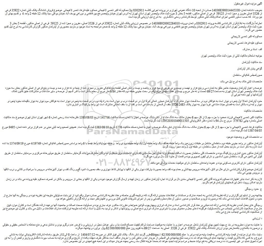بموجب دادنامه شماره 140368390014445338 صادره از شعبه 10 دادگاه عمومی تهران و در پرونده اجرایی کلاسه 0302911/ج3 محکوم له اکبر شمسی لاهیجانی محکوم علیه فرهاد شمس لاهیجانی  موضوع فروش ششدانگ پلاک ثبتی شماره 35922 فرعی از 3526 اصلی مفروز و مجزا شده از 59125  فرعی از اصلی مذکور، قطعه 5 بخش 3 حوزه ثبت ملک ولیعصر تهران استان تهران به آدرس تهران خیابان ولیعصرعج بین فاطمی و دوراهی یوسف آباد خیابان بوعلی سینا پلاک 12 طبقه 2 واحد 4  و تقسیم بهای آن بین وراث  که حسب دستور قاضی اجرای احکام پلاک ثبتی مذکور توسط کارشناس رسمی دادگستری   به شرح ذیل ارزیابی گردیده است