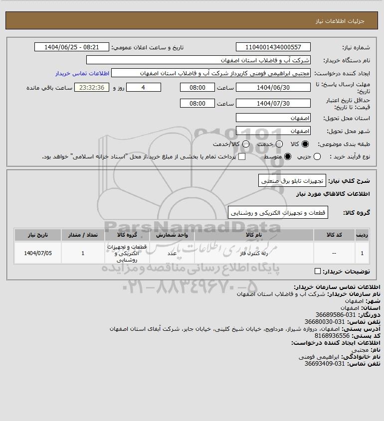 | 1 | -- | رله کنترل فاز | عدد | قطعات و تجهیزات الکتریکی و روشنایی | 1 | 1404/07/05 |