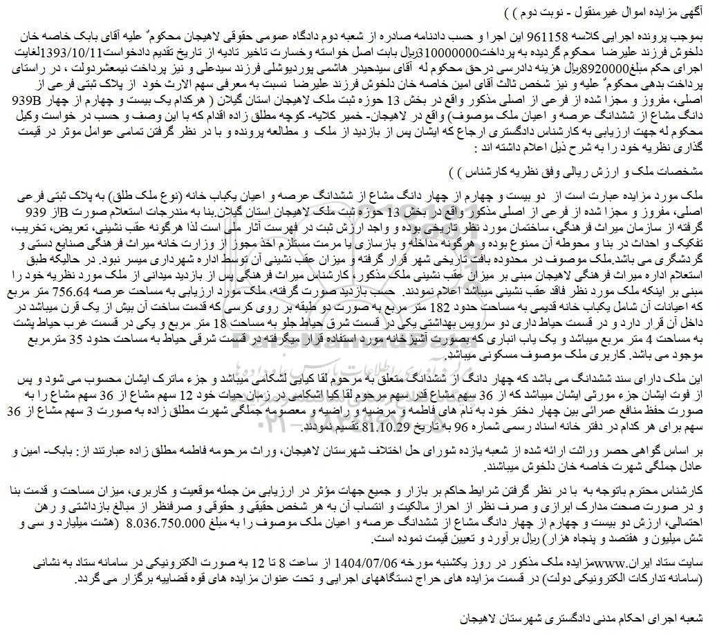 ملک مورد مزایده عبارت است از دو بیست و چهارم از چهار دانگ مشاع از ششدانگ عرصه و اعیان یکباب خانه (نوع ملک طلق) به پلاک ثبتی فرعی از 939b اصلی، مفروز و مجزا شده از فرعی از اصلی مذکور واقع در بخش 13 حوزه ثبت ملک لاهیجان استان گیلان.بنا به مندرجات استعلام صورت گرفته از سازمان میراث فرهنگی، ساختمان مورد نظر تاریخی بوده و واجد ارزش ثبت در فهرست آثار ملی است لذا هرگونه عقب نشینی، تعریض، تخریب، تفکیک و احداث در بنا و محوطه آن ممنوع بوده و هرگونه مداخله و بازسازی یا مرمت مستلزم اخذ مجوز از وزارت خانه میراث فرهنگی صنایع دستی و گردشگری می باشد.ملک موصوف در محدوده بافت تاریخی شهر قرار گرفته و میزان عقب نشینی آن توسط اداره شهرداری میسر نبود. در حالیکه طبق استعلام اداره میراث فرهنگی لاهیجان مبنی بر میزان عقب نشینی ملک مذکور، کارشناس میراث فرهنگی پس از بازدید میدانی از ملک مورد نظریه خود را مبنی بر اینکه ملک مورد نظر فاقد عقب نشینی میباشد اعلام نمودند. حسب بازدید صورت گرفته، ملک مورد ارزیابی به مساحت عرصه 756.64 متر مربع که اعیانات آن شامل یکباب خانه قدیمی به مساحت حدود 182 متر مربع به صورت دو طبقه بر روی کرسی که قدمت ساخت آن بیش از یک قرن میباشد در داخل آن قرار دارد و در قسمت حیاط داری دو سرویس بهداشتی یکی در قسمت شرق حیاط جلو به مساحت 18 متر مربع و یکی در قسمت غرب حیاط پشت به مساحت 4 متر مربع میباشد و یک یاب انباری که بصورت آشپزخانه مورد استفاده قرار میگرفته در قسمت شرقی حیاط به مساحت حدود 35 مترمربع موجود می باشد. کاربری ملک موصوف مسکونی میباشد.