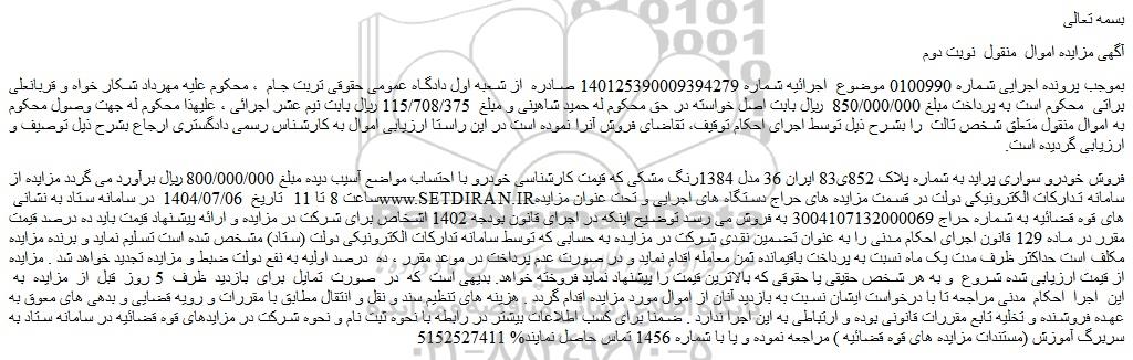 فروش خودرو سواری پراید به شماره پلاک 852ی83 ایران 36 مدل 1384رنگ مشکی که قیمت کارشناسی خودرو با احتساب مواضع آسیب دیده مبلغ 800/000/000 ریال برآورد می گردد مزایده از ساعت 8 تا 11 تاریخ 1404/07/06 در سامانه ستاد به نشانی سایت ستاد ایران سامانه تدارکات الکترونیکی دولت در قسمت مزایده های حراج دستگاه های اجرایی و تحت عنوان مزایده های قوه قضائیه به شماره حراج 3004107132000069 به فروش می رسد توضیح اینکه در اجرای قانون بودجه 1402 اشخاص برای شرکت در مزایده و ارائه پیشنهاد قیمت باید ده درصد قیمت مقرر در ماده 129 قانون اجرای احکام مدنی را به عنوان تضمین نقدی شرکت در مزایده به حسابی که توسط سامانه تدارکات الکترونیکی دولت (ستاد) مشخص شده است تسلیم نماید و برنده مزایده مکلف است حداکثر ظرف مدت یک ماه نسبت به پرداخت باقیمانده ثمن معامله اقدام نماید و در صورت عدم پرداخت در موعد مقرر ، ده درصد اولیه به نفع دولت ضبط و مزایده تجدید خواهد شد . مزایده از قیمت ارزیابی شده شروع و به هر شخص حقیقی یا حقوقی که بالاترین قیمت را پیشنهاد نماید فروخته خواهد. بدیهی است که در صورت تمایل برای بازدید ظرف 5 روز قبل از مزایده به این اجرا احکام مدنی مراجعه تا با درخواست ایشان نسبت به بازدید آنان از اموال مورد مزایده اقدام گردد . هزینه های تنظیم سند و نقل و انتقال مطابق با مقررات و رویه قضایی و بدهی های معوق به عهده فروشنده و تخلیه تابع مقررات قانونی بوده و ارتباطی به این اجرا ندارد . ضمنا برای کسب اطلاعات بیشتر در رابطه با نحوه ثبت نام و نحوه شرکت در مزایدهای قوه قضائیه در سامانه ستاد به سربرگ آموزش (مستندات مزایده های قوه قضائیه ) مراجعه نموده و یا با شماره 1456 تماس حاصل نمایند% 5152527411