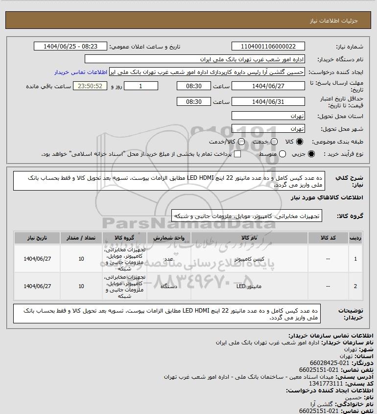 شرح کلی نیاز: ده عدد کیس کامل و ده عدد مانیتور 22 اینچ LED HDMI مطابق الزامات پیوست. تسویه بعد تحویل کالا و فقط بحساب بانک ملی واریز می گردد.