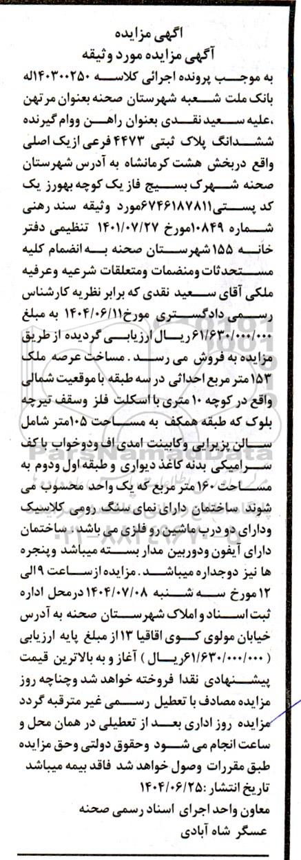 مزایده فروش ملک به مساحت 153 مترمربع پلاک ثبتی 4473 فرعی از یک اصلی