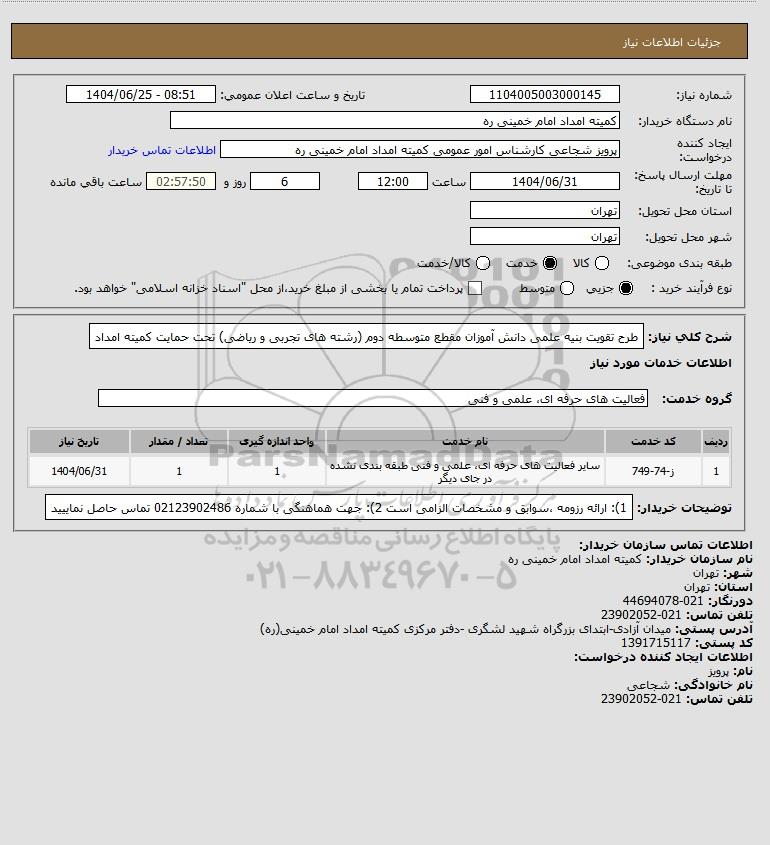 شرح کلی نیاز: طرح تقویت بنیه علمی دانش آموزان مقطع متوسطه دوم (رشته های تجربی و ریاضی) تحت حمایت کمیته امداد