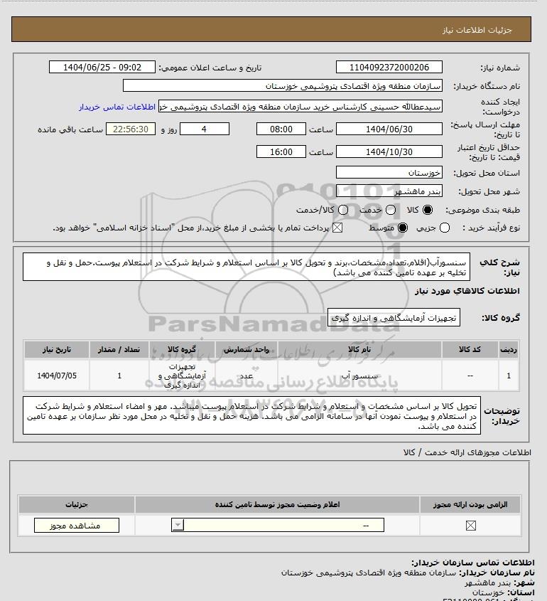 شرح کلی نیاز: سنسورآب(اقلام،تعداد،مشخصات،برند و تحویل کالا بر اساس استعلام و شرایط شرکت در استعلام پیوست.حمل و نقل و تخلیه بر عهده تامین کننده می باشد)