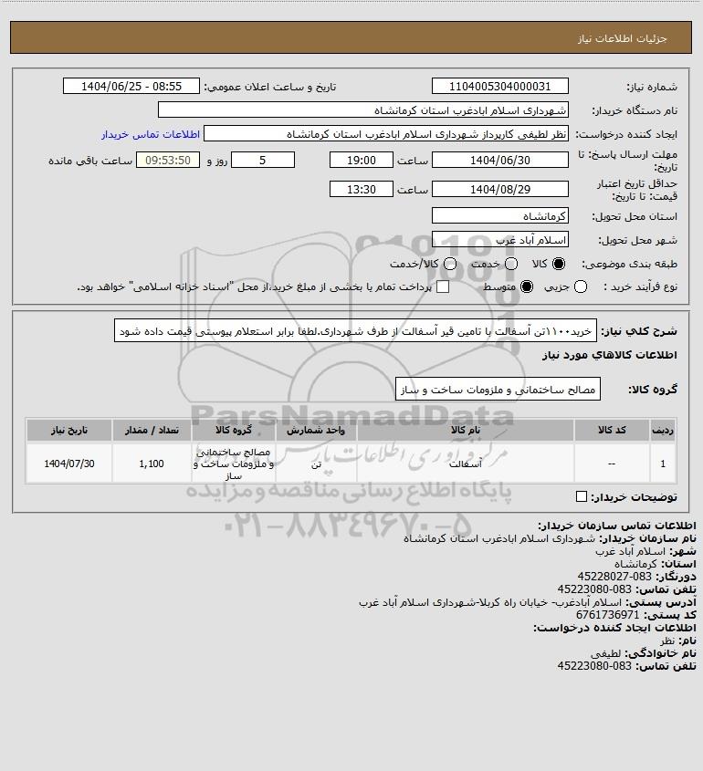 شرح کلی نیاز: خرید۱۱۰۰تن آسفالت با تامین قیر آسفالت از طرف شهرداری.لطفا برابر استعلام پیوستی قیمت داده شود