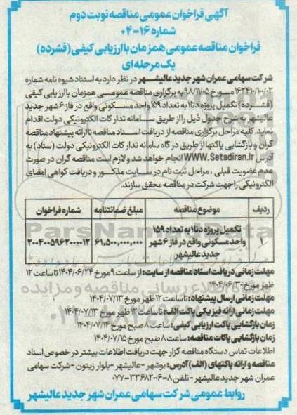 شرکت سهامی عمران شهر جدید عالیشهر در نظر دارد به استناد شیوه نامه شماره 162410.100.02 مورخ 98.1705 به برگزاری مناقصه عمومی همزمان با ارزیابی کیفی (فشرده) تکمیل پروژه دنا 1 به تعداد 159 واحد مسکونی واقع در فاز 6 شهر جدید عالیشهر به شرح جدول ذیل را از طریق سامانه تدارکات الکترونیکی دولت اقدام نماید. کلیه مراحل برگزاری مناقصه از دریافت اسناد مناقصه تا ارائه پیشنهاد مناقصه گران و بازگشایی پاکتها از طریق درگاه سامانه تدارکات الکترونیکی دولت (ستاد) به آدرس ستاد ایران انجام خواهد شد و لازم است مناقصه گران در صورت عدم عضویت قبلی ، مراحل ثبت نام در سایت مذکور و دریافت گواهی امضای الکترونیکی را جهت شرکت در مناقصه محقق سازند.