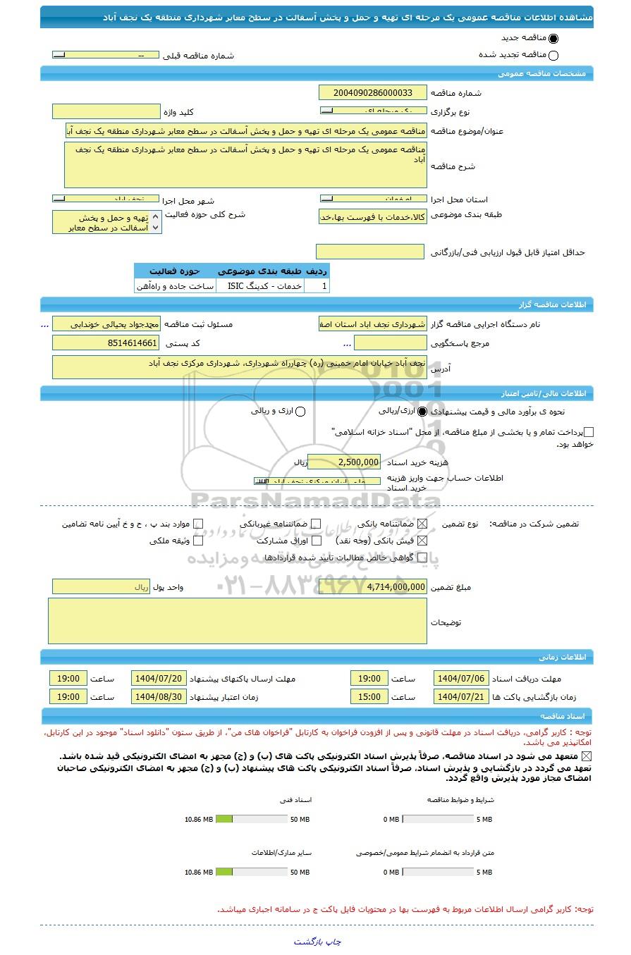 نام دستگاه اجرایی مناقصه گزارشهرداری نجف اباد استان اصفهانمسئول ثبت مناقصهمحمدجواد یحیائی خوندابی