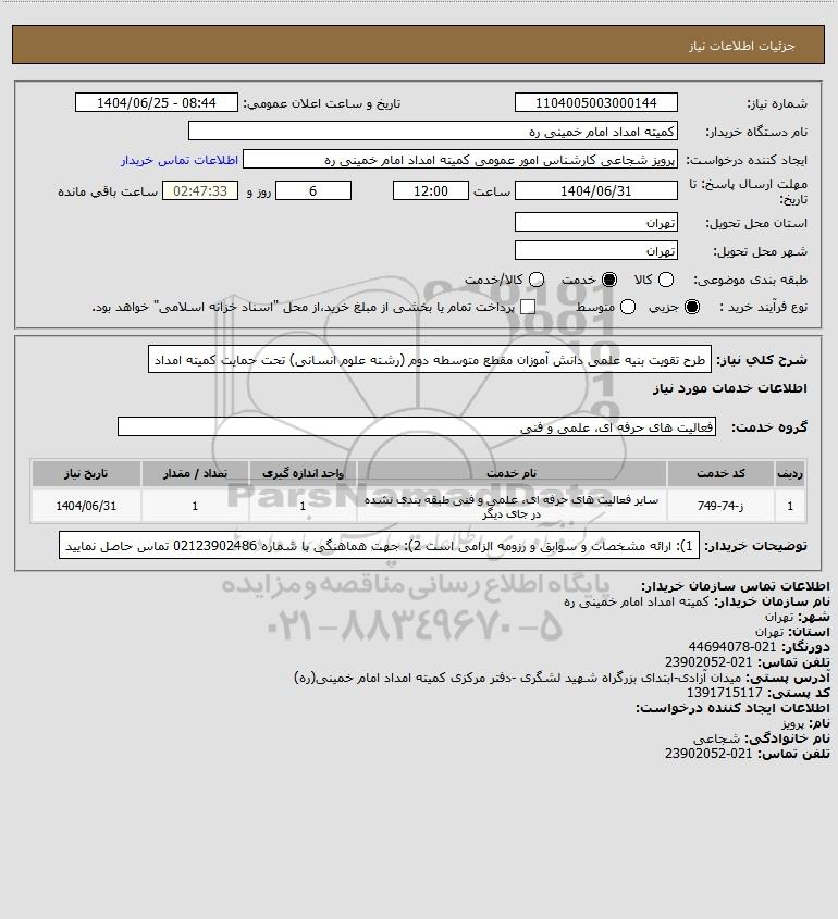 شرح کلی نیاز: طرح تقویت بنیه علمی دانش آموزان مقطع متوسطه دوم (رشته علوم انسانی) تحت حمایت کمیته امداد