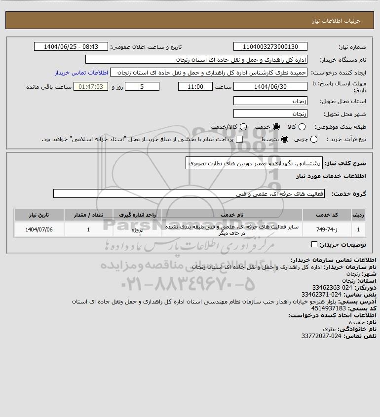 شرح کلی نیاز: پشتیبانی، نگهداری و تعمیر دوربین های نظارت تصویری