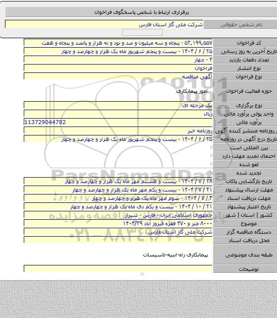 مناقصه ۸۰۰۰ متر و ۴۷۰ فقره فیروز آباد ۱۴۰۴/۳۹ از کلیه افراد متخصص و شرکتها واجد شرایط دعوت به عمل میآید در مناقصه با کد خبرگزاری پارس نماد: 9554052 شرکت نمایند.