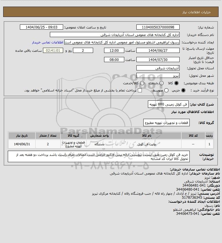 شرح کلی نیاز: فن کوئل زمینی 800 تهویه