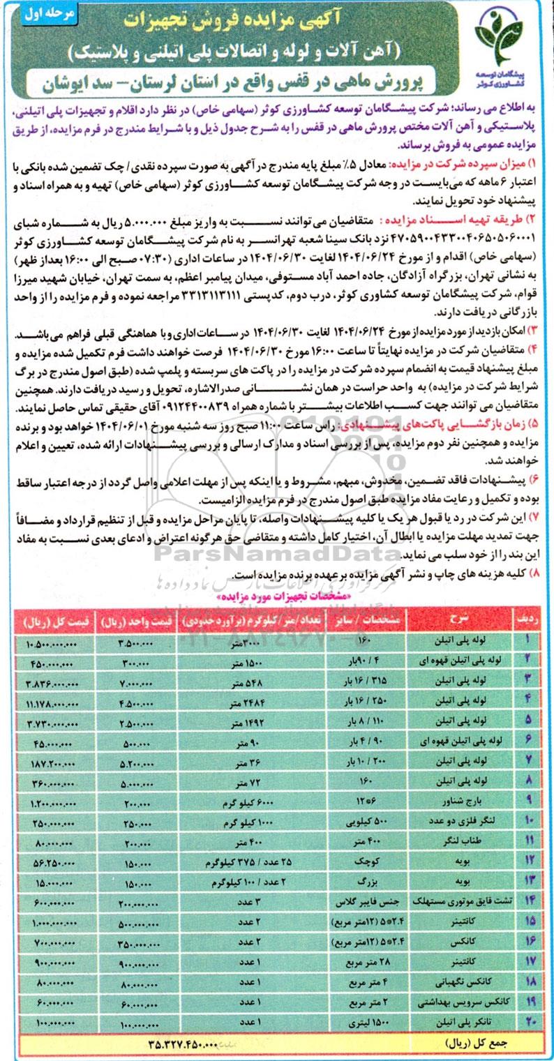 به اطلاع میرساند؛ شرکت پیشگامان توسعه کشاورزی کوثر (سهامی خاص ) در نظر دارد اقلام و تجهیزات پلی اتیلنی ،پلاستیکی و آهن آلات مختص پرورش ماهی در قفس را به شرح جدول ذیل و با شرایط مندرج در فرم مزایده از طریق مزایده عمومی به فروش برساند.
