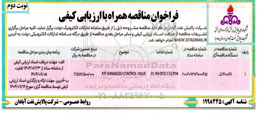 1 61/ 400/ ک  2004092179000451  01-90-0031172.P04 P/F SHIMADZU CONTROL VALVE 2.517.500.000 الف- مهلت دریافت اسناد ارزیابی کیفی از سامانه ستاد از تاریخ 1404.6.22 لغایت 1404.7.5