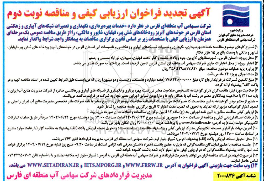 شرکت سهامی آب منطقه ای فارس در نظر دارد خدمات بهره برداری، نگهداری و تعمیرات شبکه های آبیاری و زهکشی استان فارس در حوضه های آبریز رودخانه های شش پیر ،فهلیان، شاپور و دالکی را از طریق مناقصه عمومی یک مرحله ای همزمان با ارزیابی کیفی با مشخصات زیر بر اساس قانون برگزاری مناقصات به پیمانکار واجد شرایط واگذار نماید.