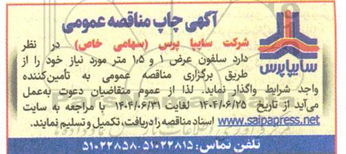 شرکت سایپا پرس (سهامی خاص) در نظر دارد سلفون عرض 1 و 1.5 متر مورد نیاز خود را از طریق برگزاری مناقصه عمومی به تامین کننده واجد شرایط واگذار نماید