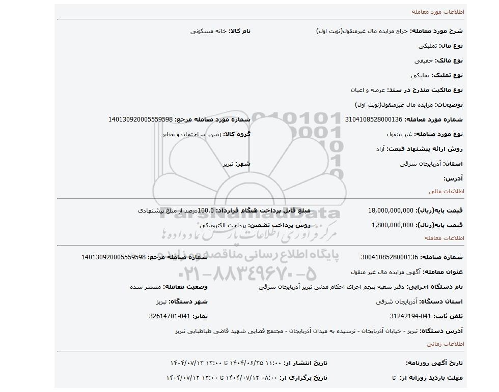 9 مزایده دستور فروش ملک مشاعی 9810687 1404/08/15 new not special not payed آذربایجان شرقی