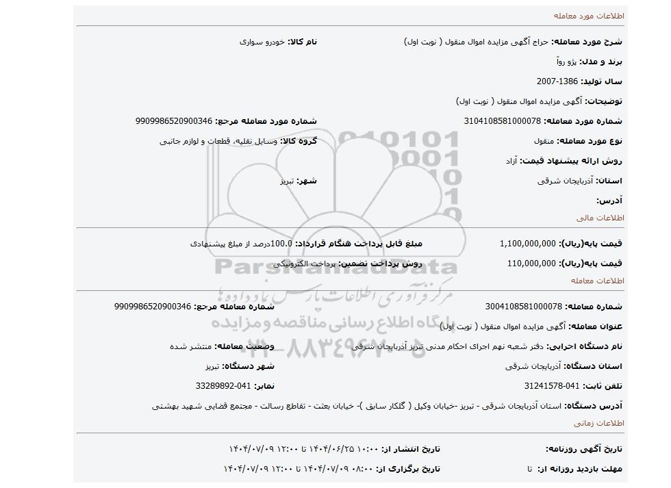 شرح مورد معامله: حراج آگهی مزایده اموال منقول ( نوبت اول) نام کالا: خودرو سواری