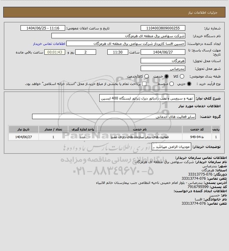 شرح کلی نیاز: تهیه و سرویس و نصب رادیاتور دیزل ژنراتور ایستگاه 400 ایسین