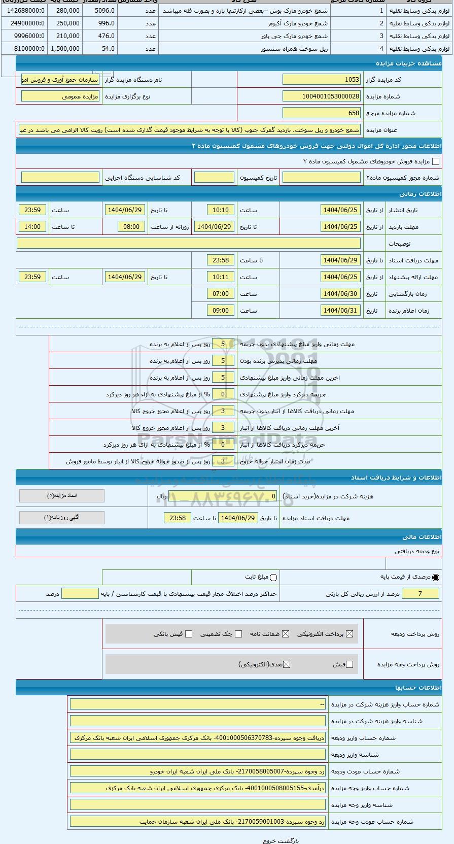 | کد مزایده گزار | 1053 | نام دستگاه مزایده گزار | سازمان جمع آوری و فروش اموال تملیکی | |