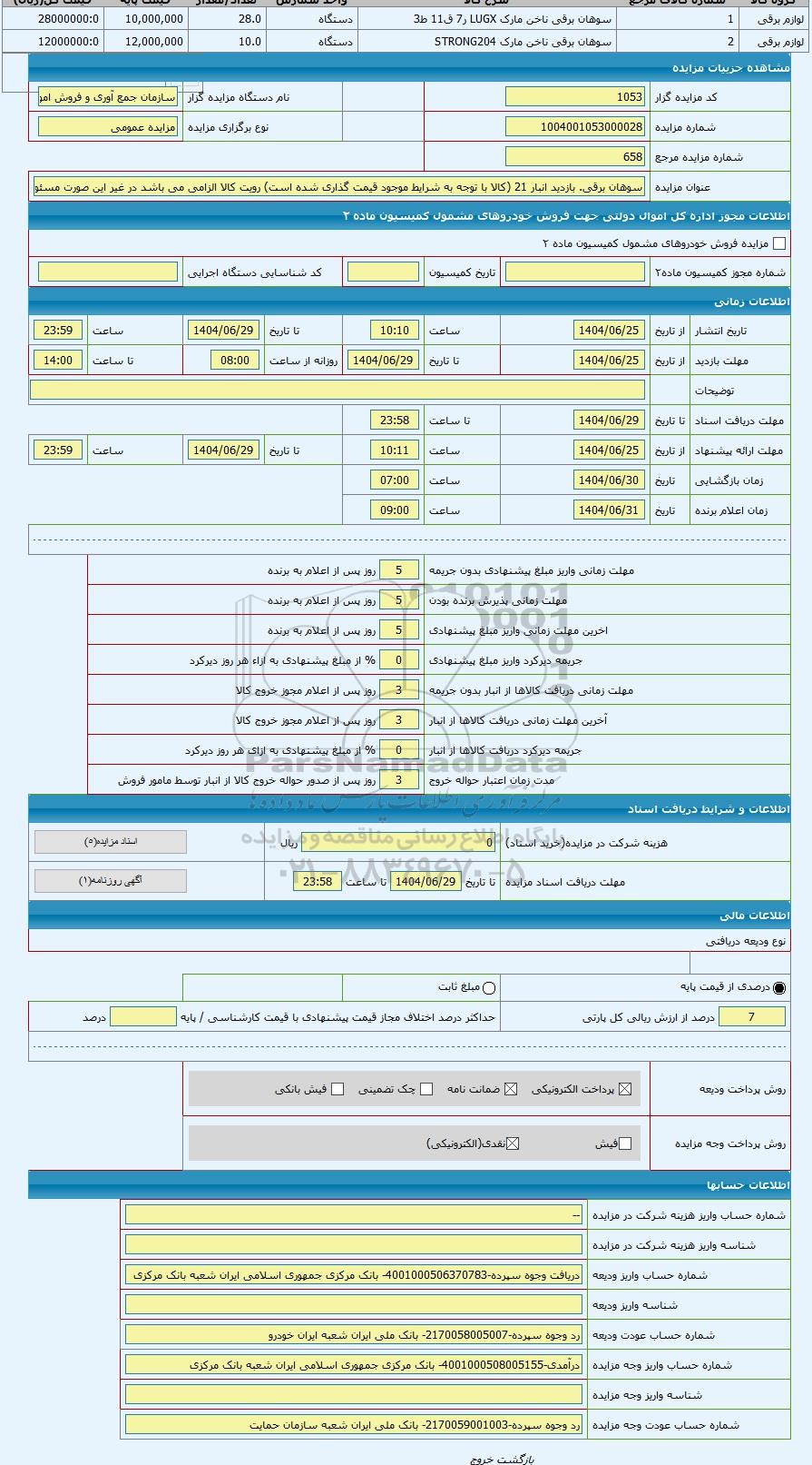 | کد مزایده گزار | 1053 | نام دستگاه مزایده گزار | سازمان جمع آوری و فروش اموال تملیکی | |