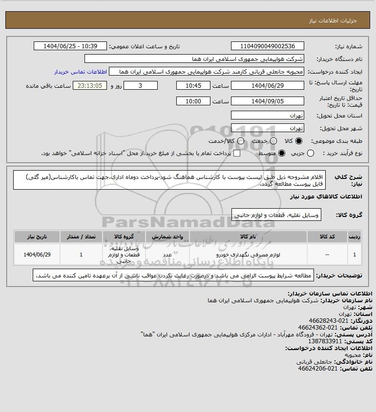 شرح کلی نیاز: اقلام مشروحه ذیل طبق لیست پیوست با کارشناس هماهنگ شود-پرداخت دوماه اداری،جهت تماس باکارشناس(میر گلی) فایل پیوست مطالعه گردد.