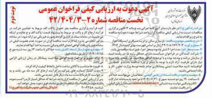 شرکت راه آهن ج.ا.ا در نظر دارد بنابر آئین نامه اجرائی بند ج ماده 12 قانون برگزاری مناقصات نسبت به ارزیابی کیفی مناقصه گران واجد شرایط جهت دعوت به مناقصه به شرح زیر اقدام نماید.