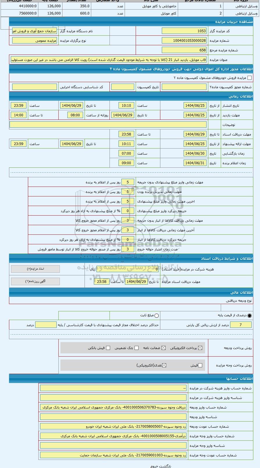 | کد مزایده گزار | 1053 | نام دستگاه مزایده گزار | سازمان جمع آوری و فروش اموال تملیکی | |