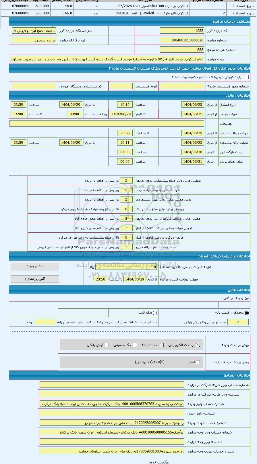 | کد مزایده گزار | 1053 | نام دستگاه مزایده گزار | سازمان جمع آوری و فروش اموال تملیکی | |