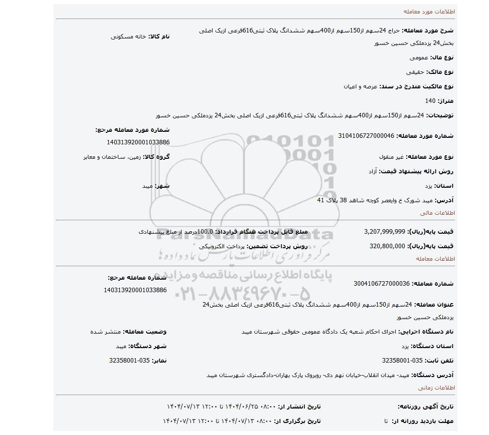 مزایده 24سهم از150سهم از400سهم ششدانگ پلاک ثبتی616فرعی ازیک اصلی بخش24 یزدملکی حسین خسور, مزایده، 24سهم از150سهم از400سهم ششدانگ پلاک ثبتی616فرعی ازیک اصلی بخش24 یزدملکی حسین خسور