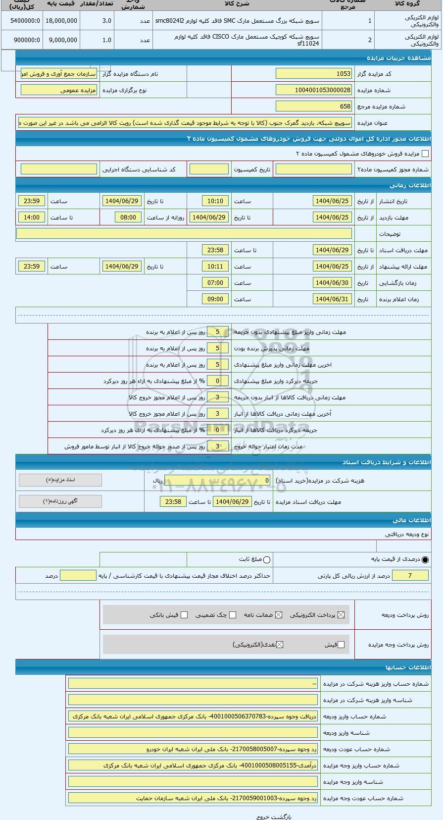 | عنوان مزایده | سوییچ شبکه. بازدید گمرک جنوب (کالا با توجه به شرایط موجود قیمت گذاری شده است) رویت کالا الزامی می باشد در غیر این صورت مسئولیت آن بر عهده خریدار می باشد. | |||